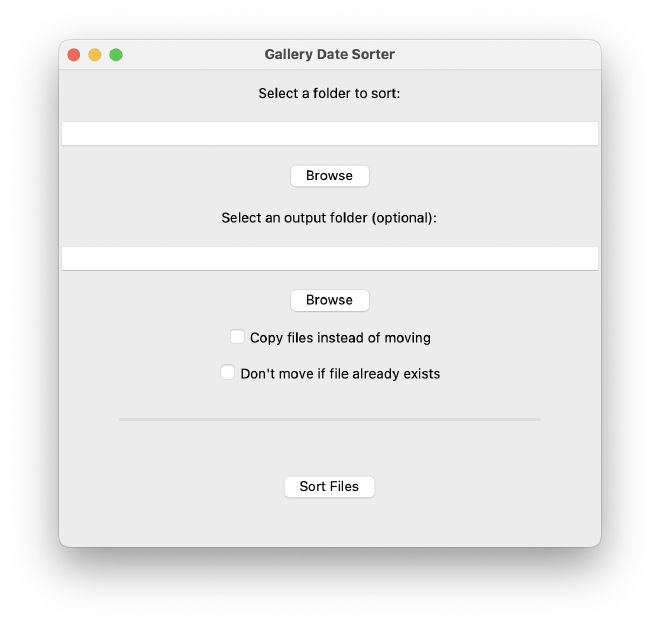 This project is a simple cross‑platform utility that sorts images and videos into date named folders based on their creation dates. With my ever growing photo library I needed a dead simple and free way to sort my photos from several sources. From that small pain I’ve created this project.